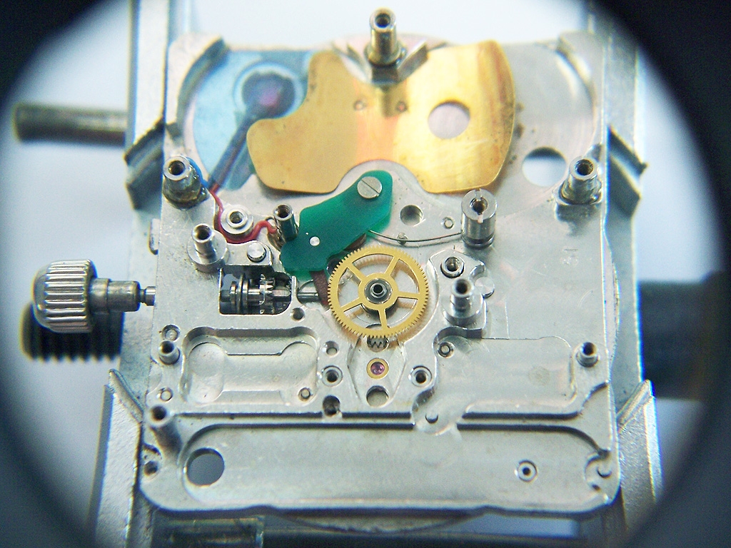 The next part to be removed is the train bridge, underneath which is a pallet lever mechanism, very unusual for a quartz calibre. Rather than a stepper motor which rotates in one direction, the 3923A has a bi-polar stator arrangement (the two red parts), reversing the polarity alternately moves the pallet lever back and forth, advancing the wheel train once per second. The second jewelled lever is present to control any backlash, resulting in a very solid second hand action.