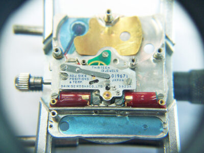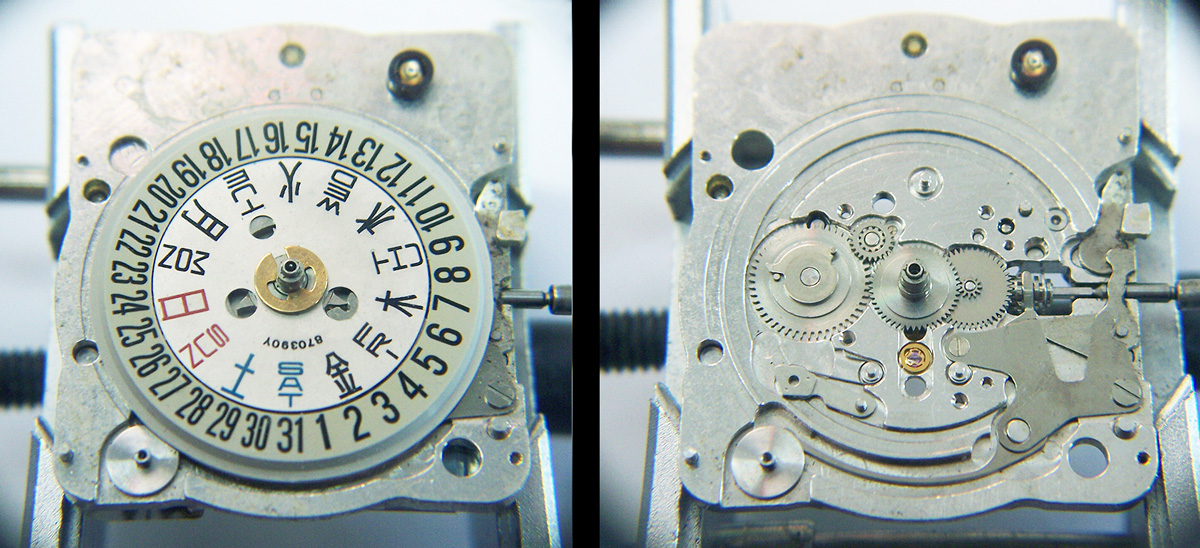 On the calendar side, things aren’t quite so complicated, thankfully. The calendar wheels are printed to display the day and date vertically at the six position and anyone familiar with vintage Seiko will probably note the similarity of many of the parts with the 7xxx series calibres from the same period.
