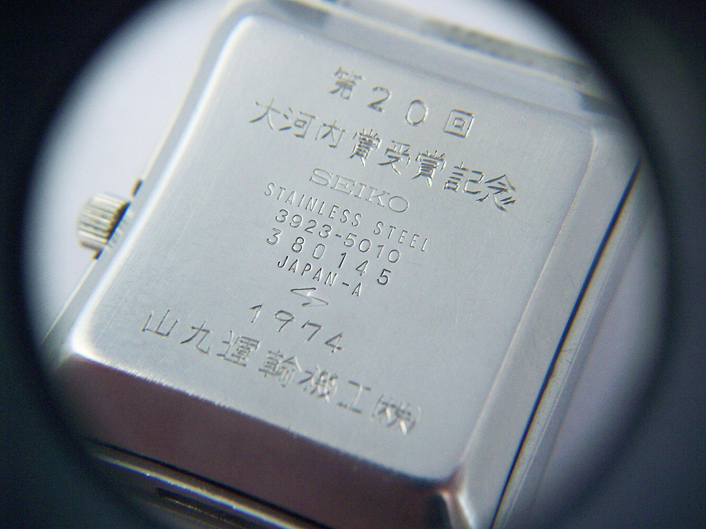Turning the watch over, from the serial number it can be deduced that this watch was made in August 1973 and the inscription reads; “20th Award Remembrance – Okochi Memorial Foundation, 1974, Sankyu Incorporated”