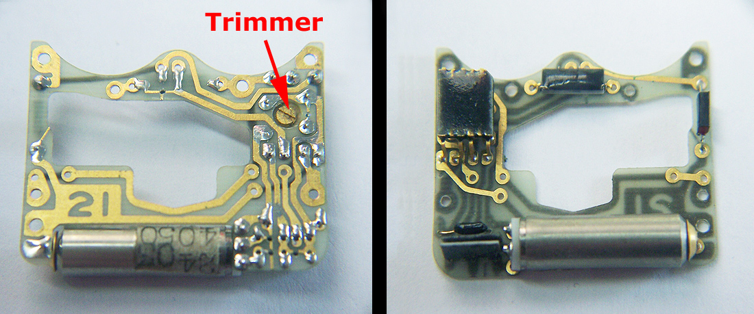 The printed circuit board contains the quartz crystal (housed in the silver tube) and the CMOS controller chip which is fitted with a trimmer for fine tuning the accuracy. It’s interesting to note that the quartz crystal in this calibre was precisely cut to ensure optimum performance between 84 and 88 degrees, the typical temperature of the skin, ensuring that the watch was at its most accurate when worn.