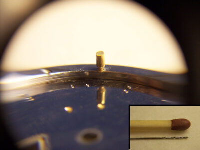Here is a picture of a new dial foot in place (and inset is the 0.5mm drill used to remove the old feet alongside a match… small stuff!)
