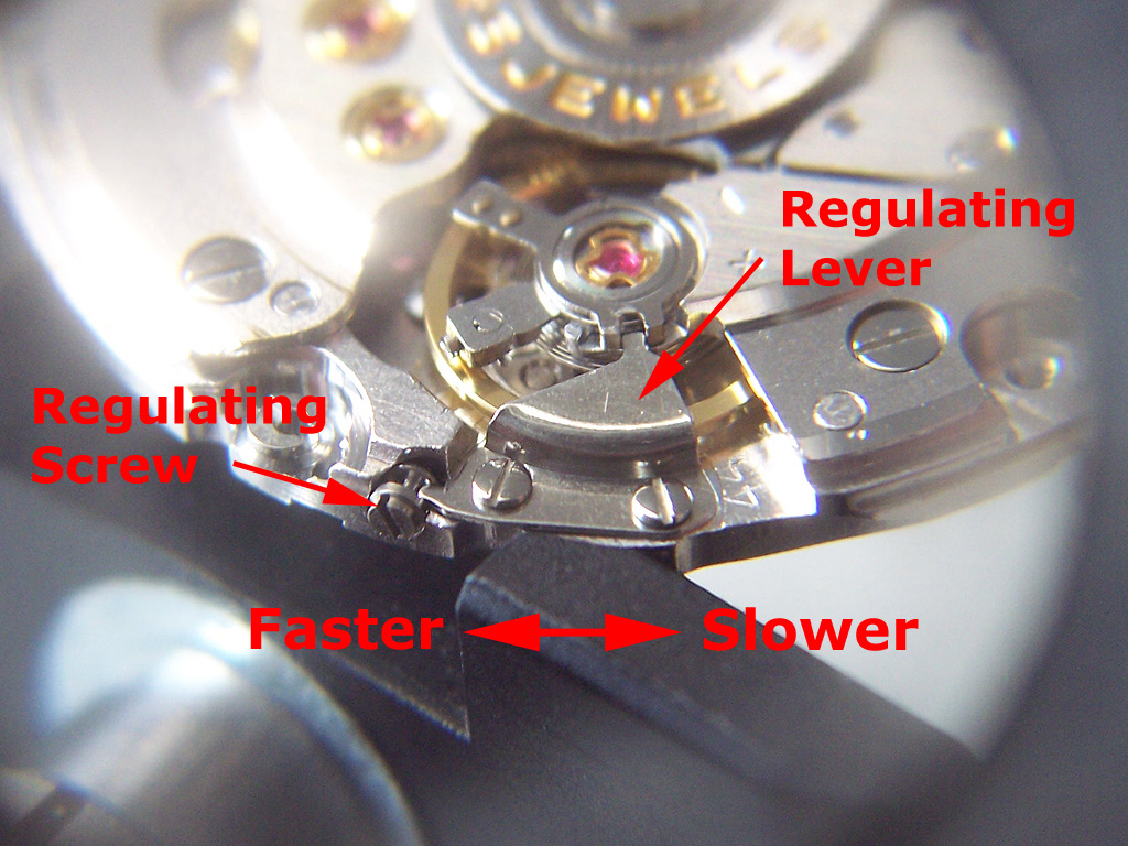 The screw between the lugs is removed from the case and a small screwdriver can then be used to rotate the regulating screw, sliding the connected lever either left or right to increase or decrease the rate of the watch. A very useful feature.