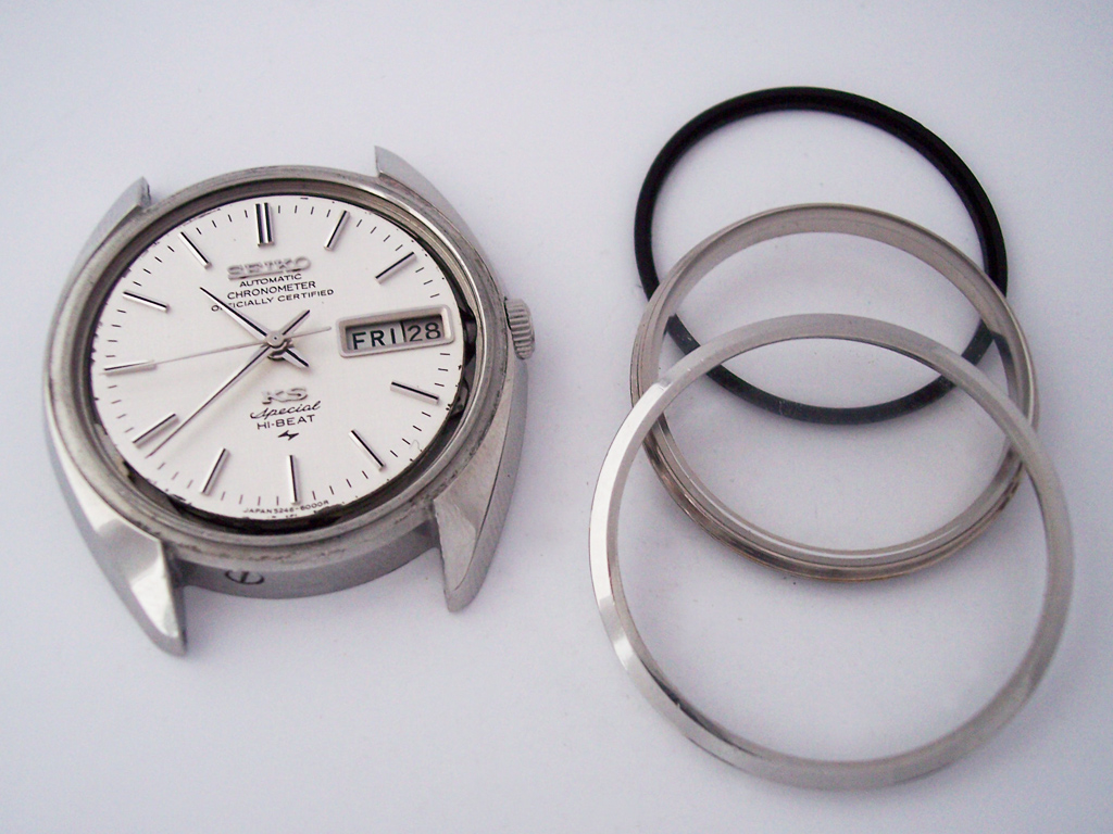To open the watch the bezel has to be levered off and the crystal and gasket removed. The mineral crystal is mounted in a stainless steel ring which slots into the gasket and the bezel compresses the two to form a waterproof seal.