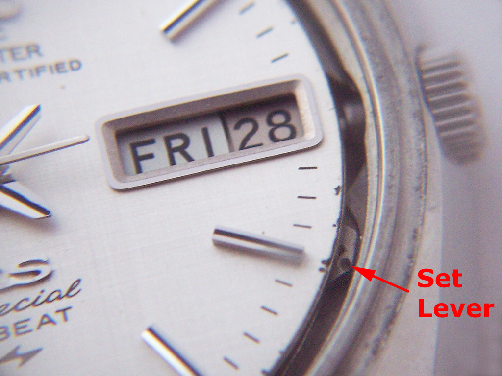 When removed, a pin or small screwdriver is then used to press down the lever opposite the 4 marker on the dial and the stem and crown can be pulled out.