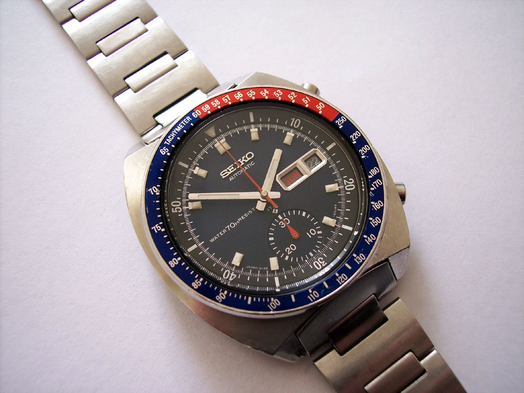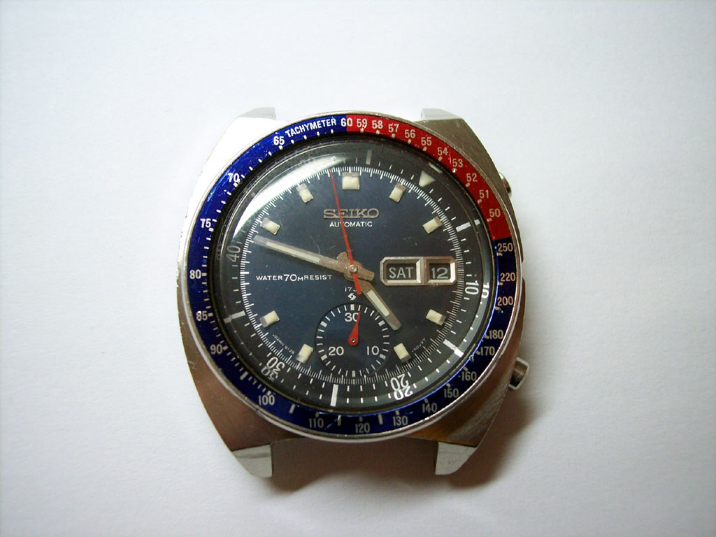 Known as the “Pepsi Chrono” because of the blue and red bezel insert, this particular watch is one of the earliest models which has a number of subtle differences that were phased out in later versions. When looking at the case you will notice a small section has been cut out to allow easier access to the crown, the dial has ‘Water70MResist’ written on it, and the centre second hand is the thin, two piece version only seen on early 6139 models.