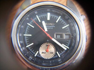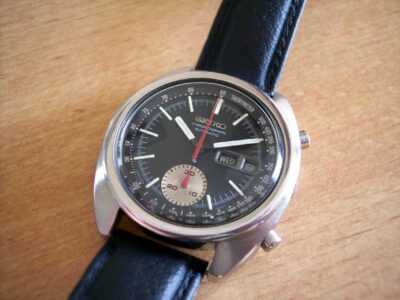 The case and crystal were near perfect on the black dialled watch, so when the movement was running properly, all that was left to do was repaint the chrono hands. Here’s the ‘after’ shots…