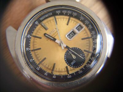The gold dialled watch provided all I needed both cosmetically and mechanically for this one. The Tachymeter bezel was perfect, the subdial hand was an original, and the winding mechanism was great too. I didn’t mind plundering this one as the dial had lost all it’s lustre. It’s hard to tell from the photo but the dial has faded to a greenish colour below the subdial.