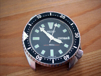 Many of the dials and hands are replaced on diver’s watches due to moisture penetrating the water seals, eventually discolouring the lume. As original dials and hands are no longer available, aftermarket parts are a cheap way to make the watch look presentable again.