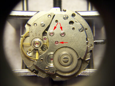 The cosmetic parts weren’t the only thing changed in this watch. Removing the winding bridge I was surprised to see Diafix caps on the third and escape wheels and a jewel for the fourth wheel pivot.