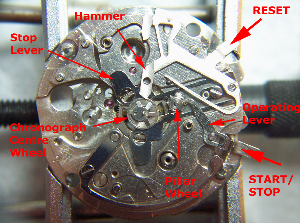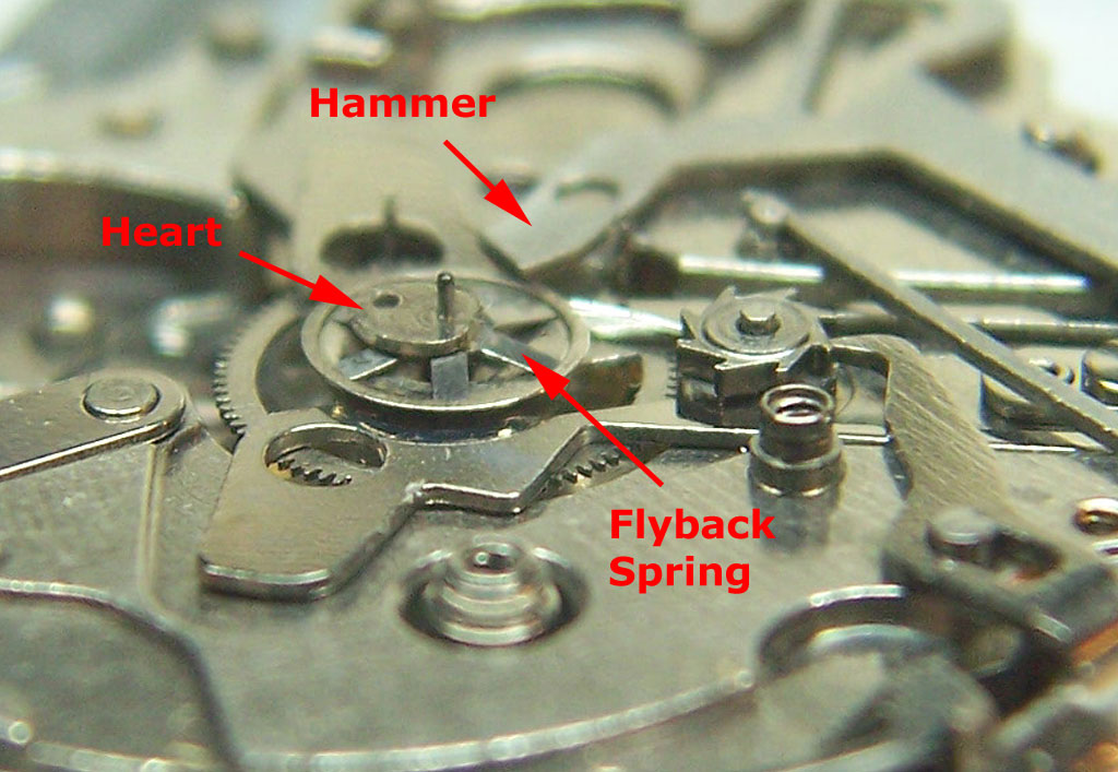 When the reset button is pressed, the spring loaded hammer moves across and contacts the chronograph heart, rotating the mechanism back to zero from any position.