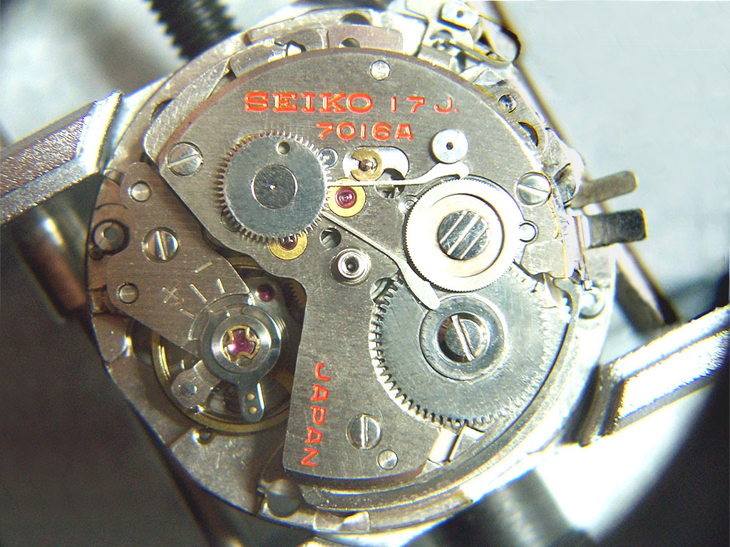 Although the most complex, with 17 jewels, the 7016A has the least number of jewels in the calibre series; the 7015 and 7017 calibres both have 21 jewels (additional cap jewels on the third and escape wheel pivots), and the 7018 has 23 jewels (two more jewels for the minute recording wheel). The jewel positions are typical of any 17 jewel Seiko automatic calibre in that all but one of the train wheel pivots are jewelled, and two jewels are used in the winding mechanism.