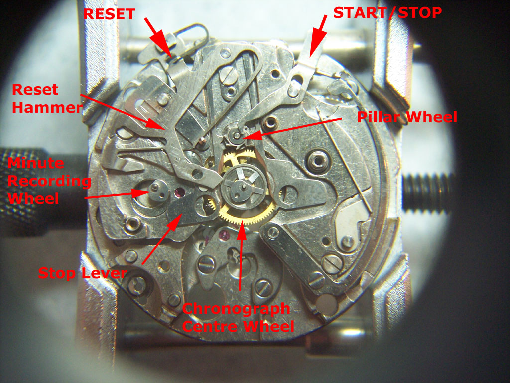 The chronograph operation is identical: On pressing the start/stop button, the operating lever pushes the pillar wheel forward which prises apart the stop lever, allowing the clutch ring to drop onto the clutch plate on the fourth wheel below. The second hand starts to move as it is mounted on the axle of the chronograph centre wheel, which extends through the movement and out onto the dial.
