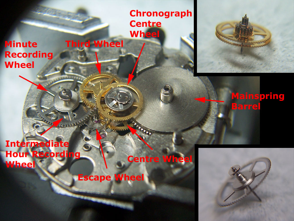 The upper inset picture shows the third wheel which consists of two separate wheels on a single axle, each driven by a different pinion. The upper gear behaves just like a regular third wheel in that it transfers power from the centre wheel to the fourth wheel. The lower gear is used only when the chronograph is engaged, transferring power from the chronograph centre wheel to the minute recording wheel.