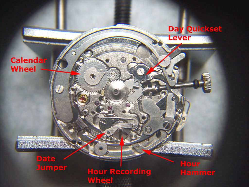 As you can see in the picture, the wheel train is very compact. Rather than redesign the main plate to accommodate intermediate wheels and levers to operate the registers, Seiko chose to make changes to the wheels themselves.
