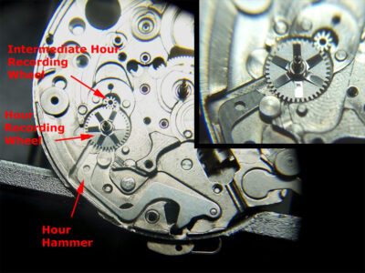 The lower inset picture shows the minute recording wheel, the axle of which extends through the movement and out onto the dial (the minute register is mounted on this axle). Inside the central housing is a friction spring used during reset. Beneath the minute recording wheel you can see the intermediate hour recording wheel which transfers power to the hour recording wheel on the dial side of the movement.