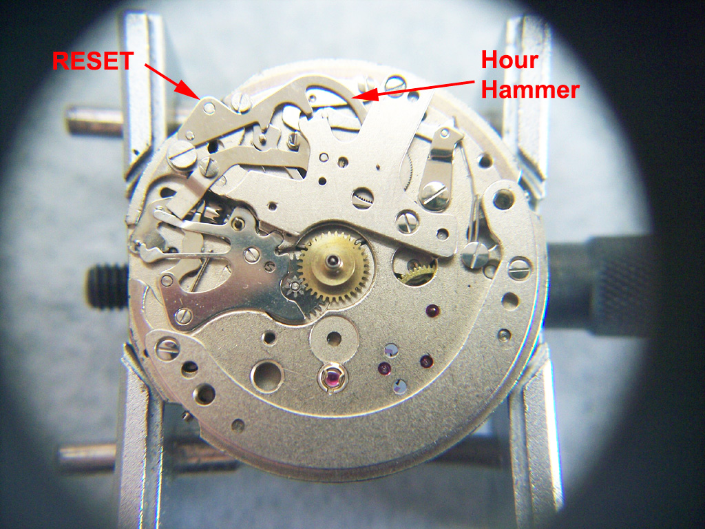 The picture above shows the fully assembled mechanism, and highlighted is the reset hammer which moves across and sets the subdial back to zero when the reset button is pressed. The following picture shows the mechanism with the cover plate removed.