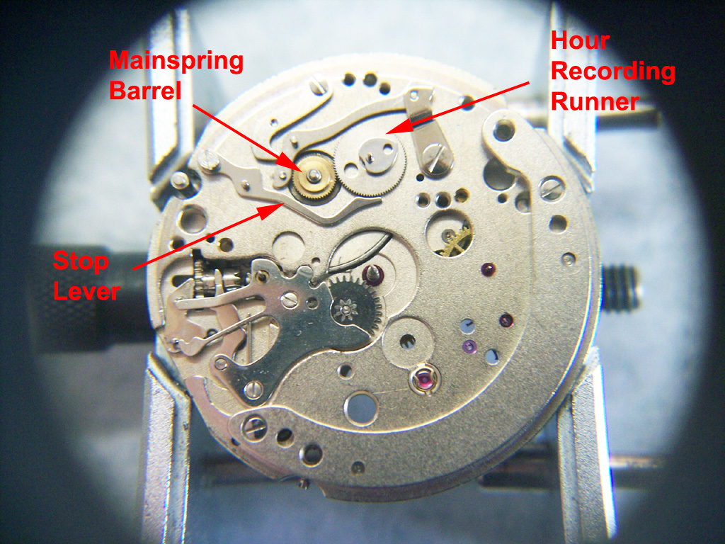 You can see that the hour recording runner is powered directly from the mainspring barrel, and also pictured is the stop lever which is lifted from the runner when the chronograph is engaged, allowing it to turn along with the mainspring barrel. When disengaged, the stop lever arrests the runner and under the gear on the mainspring barrel arbor is a friction washer so the barrel can continue to rotate unimpeded.