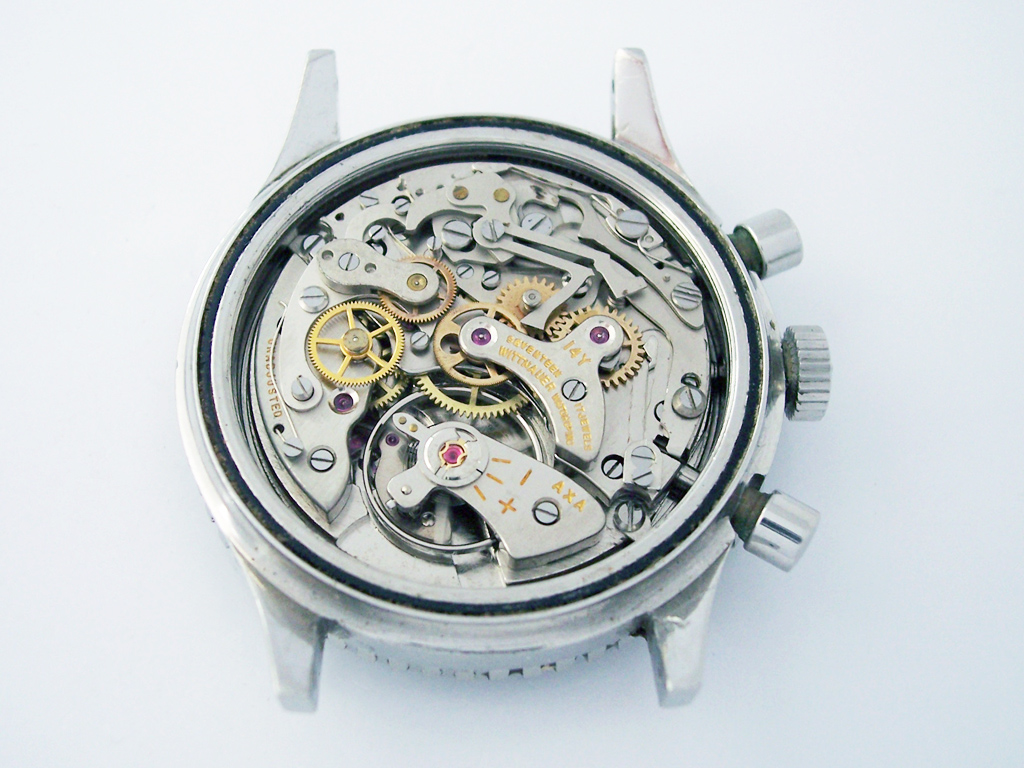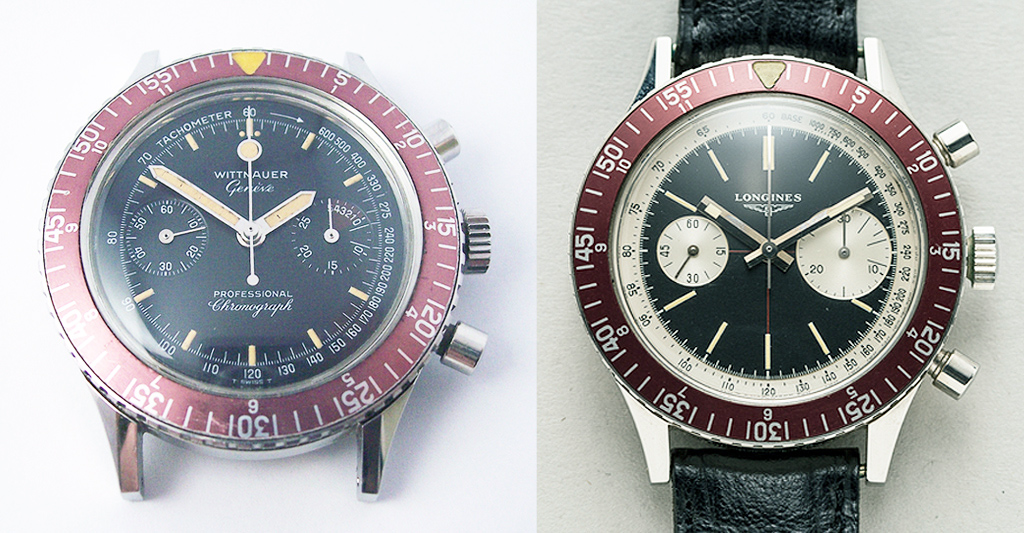 One of the most recognisable vintage Wittnauer chronographs is the sibling of the watch in this post and is featured in the advert above, the Ref: 7004A. With its burgundy bezel and large size it’s a favourite with vintage chronograph collectors and demonstrates the similarity with Longines’ watches when compared with the Longines Ref: 7981-3 Skin Diver from the same period.
