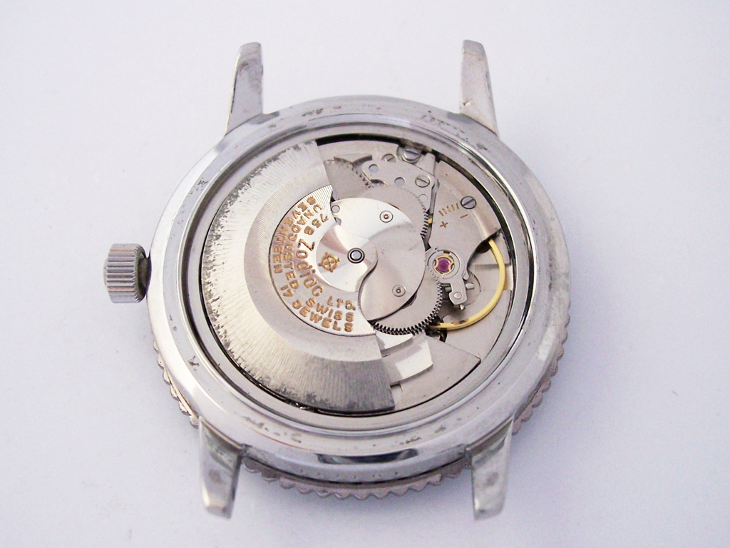 The movement was in decent condition with just a little tarnish around the edge of the winding rotor. This kind of tarnish is a common sight on vintage watches as any evaporated moisture that makes its way past the gaskets condenses on the coldest part, the winding rotor, the droplets forming on the outer edge as it spins. Being a plated base metal (in most cases), if it isn’t caught in time, the plating on the rotor is steadily eroded to reveal the base metal underneath.